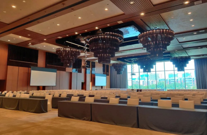 酒店的大宴會廳位于酒店二樓,場地面積1100平米,層高8米?,F場擴聲采用了EV的12寸吸頂音箱,均勻的聲場分布,充足的聲壓級,讓大宴會廳舉辦的活動,無論是會議還是宴會,擴聲都得到了保證。因為場地天花內設備管道眾多,施工時使用了更薄的方形箱體,在不破壞裝修的情況下,節省了空間,更加的美觀。