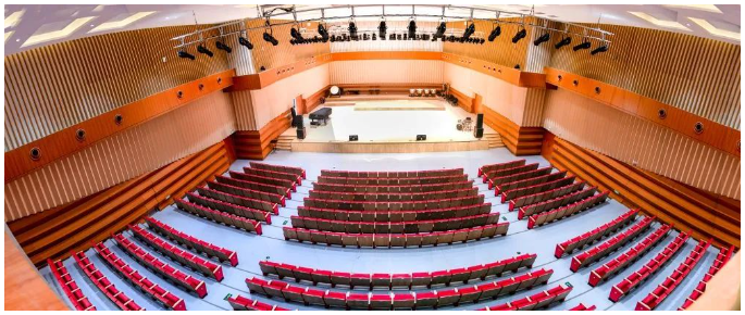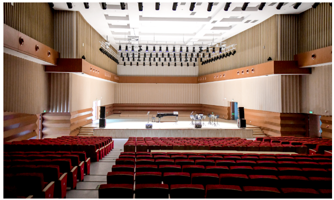 “琴島”音樂廳建筑面積2100平方米,內(nèi)部結(jié)構(gòu)呈扇形狀,扇形音樂廳的天頂呈等勢(shì)的遞進(jìn),目的是令聲學(xué)能量均勻擴(kuò)散。在這種音樂廳中,聲樂的直接信號(hào)更容易送達(dá)。