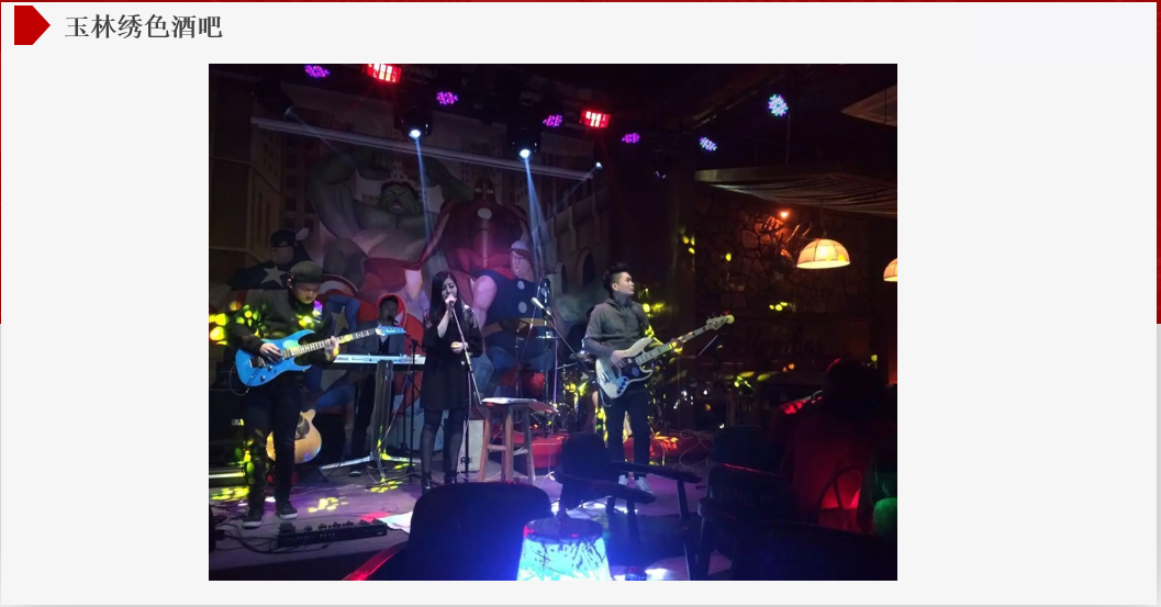 繡色酒吧是玉林市為數不多的現場樂隊類型的酒吧,開張之后,生意火爆,并經常邀請國內外的實力派歌手駐場,演奏。