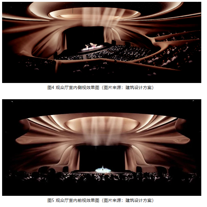 由圖4及圖5的室內效果圖可以看出,建筑設計師意在建造一座自然流暢渾然天成的劇場,因此在墻面及頂面設計了大量的雙曲面,而且雙曲面自頂部自然延伸至墻面。