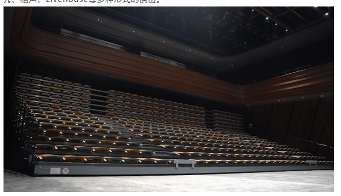 小劇場不設固定舞臺和觀眾席,使用時通過伸縮活動座椅和拼裝式舞臺布置舞臺和觀眾席。活動座椅看臺伸展時呈階梯狀,回收后靠墻層疊,美觀實用,又不占空間。