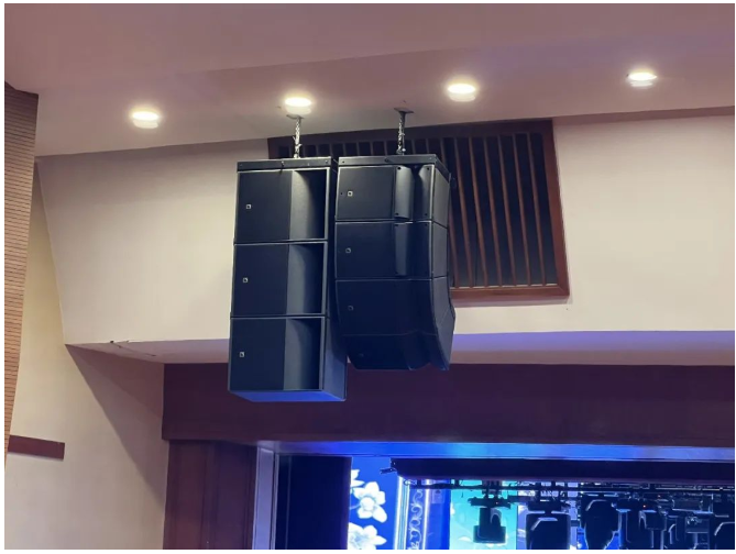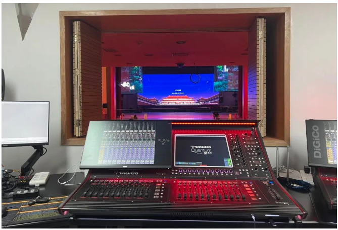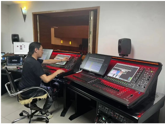 主擴使用L-Acoustics A15i(A15i Foucs、A15i Wide)。A15i擁有Panflex技術(shù),可在現(xiàn)場很直觀地調(diào)節(jié)好音箱的聲輻射方向,保證觀眾席各個區(qū)域內(nèi)都可獲得較為均勻的直達(dá)聲,精準(zhǔn)的角度投射有利于實現(xiàn)聲場的全覆蓋;低頻音箱使用KS21i,擴展低頻下限。 主擴系統(tǒng)明裝線陣列吊掛置舞臺上方,明裝吊掛使聲音不受阻擋,能大幅度減少對聲能的損失并提高清晰度。且A15i外觀干凈整潔符合場地的審美需求,是聽覺效果和視覺效果的最佳解決方案。 補聲和返送系統(tǒng)選擇X12多功能同軸系統(tǒng)揚聲器。擁有90°x60°橢形指向性,可根據(jù)現(xiàn)場聽音需求進行調(diào)整,確保獲得最真實的聽感。 臺唇比較靠近觀眾區(qū)域,選擇小巧的5XT揚聲器補充前排觀眾的聲音能量,有效避免對觀眾視覺體驗造成影響。另外,臺唇高度的設(shè)置也十分合理,恰好高于桌子避免被遮擋,使前區(qū)的聽眾獲得更多直達(dá)聲。 調(diào)音臺使用兩張DiGiCo Quantum 225互為鏡像備份,兩張同型號、同版本的調(diào)音臺之間進行實時的數(shù)據(jù)同步,一個人可同時操作兩個調(diào)音臺,方便快捷。主備設(shè)備還能隨時切換,穩(wěn)定性大幅提高,全面保障演出過程中音頻信號穩(wěn)定傳輸。 升級改造后的效果受到大家的一致好評,沉浸式的聽音環(huán)境有效提高觀眾的感官體驗,震撼的效果深深感染和陶醉著在場的每一位觀眾,引發(fā)強烈的情感共鳴。